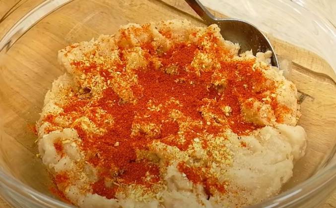 2. Пока займемся начинкой. 400 граммов фарша, у меня фарш из куриных грудок. Солю, добавляю лук, у меня сегодня сушеный, но конечно можно взять и свежий. Добавляем немного сухого чеснока, сладкую красную паприку и свежую кинзу (можно заменить на петрушку), все хорошо перемешиваем. Стол подпыляю мукой, само тесто подпыляем. Из теста формируем небольшую колбаску и делим на 10 частей. Смотрите как тесто сейчас выглядит - пузырится, благодаря разрыхлителю теста. Остальные кусочки я прикрыла полотенцем, чтобы не заветривались. Один кусочек подпыляем мукой и раскатываем в тонкую лепешку. Если хотите идеальный круг - можно например сверху положить тарелку и подрезать, но я не буду делать так для своих.