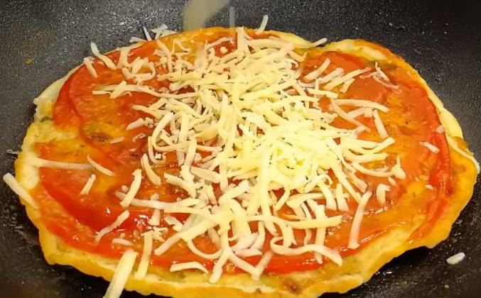 4. Также обжариваем лепешку с мясной стороны. Смазываем ароматным кетчупом, и сверху посыпаем натертым сыром. Накрываем крышкой, чтобы сыр расплавился. Еще минутка и мини пицца готова. То же самое проделываем с остальными лепешками. Из этого количества получится 10 пицц.Видео рецепт ютуб ниже 👇