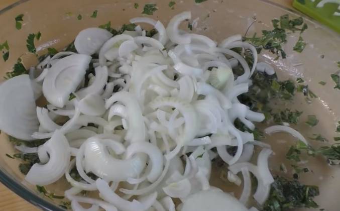3. Несмотря на то, что скумбрия жирная рыба, масло здесь растительное необходимо для того, чтобы все ароматы вот этой зелени раскрылись. Мариновалось скумбрия в холодильнике. Вот так накрыл плёнкой, и посмотрите. Ну вот несколько часов, и она хороша. Все, надо дальше готовить. Духовку включил, разогреваем на 200 градусов, и теперь лучок нарезаем вот такими вот полукольцами. Рыба пахнет умопомрачительно! Я взял три небольшие луковицы, мне будет достаточно. Рыбку вытащил, лишний маринад сверху убрал. Теперь лучок добавляем сюда к нашей зелени оставшейся. Добавили щепотку соли небольшую и вот так слегка пожмем, перемешаем.