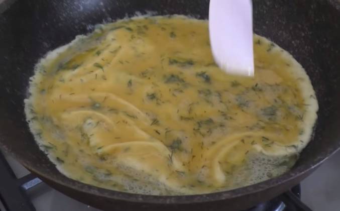 2. Добавлю щепотку соли и черного перца. Вот теперь хорошо перемешиваем. Остается только добавить немного зелени. У меня это укроп. Хорошо перемешиваем, прогреваем и выключаем. Наша начинка - половина рецепта, готова. Для второй части рецепта также растопим небольшой кусочек сливочного масла. И дальше берём три яйца, сюда щепотка соли, зелень укропа, свежемолотый перчик. И хорошо перемешиваем Отправляем яйца на сковороду. Нагрев чуть-чуть ниже среднего. И сейчас собираем поджаренные края и туда отправляем жидкое яйцо.