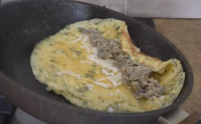 Рулет из омлета с шампиньонами на сковороде