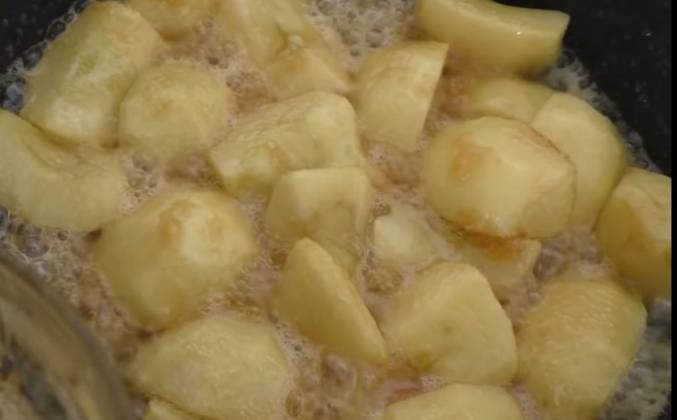 2. Муки может уйти чуть больше, чуть меньше. Ориентируйтесь даже не на количество муки, а именно на консистенцию теста. Влагоемкость муки у всех разная. Вот такое мягкое тесто, слегка липнущее должно получиться. Сейчас, когда вымешиваем, можно чуть-чуть подсыпать муки. Но главное, чтобы мы не забили тесто мукой. Убираем тесто в чашку, накрываем пленкой, даем ему расстояться примерно час в тёплом месте. Тесто почти подошло, приготовим яблоки. Для этого на сковородке растопим 100 граммов сахара. Сахар плавится очень быстро, превращаясь вот в такую карамельку. Добавляем сюда 150 граммов масла. Хорошо перемешиваем. Карамель должна быть мягкой. Отправляем сюда яблоки, порезанные на четвертинки, лучше брать небольшие местные яблочки, которые такие кисленькие твердые. У меня 6 штук. Тесто подошло отлично, прям как пушинка! Друзья, смотрите, какое классное! Обминаем его.