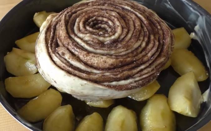 4. Каждую часть начинаем сворачивать в такой вот рулет. Не нужно прям сильно плотно это делать, потому что противном случае вылезет макушка сверху. Как только одна лента закончилась, переходим ко второй. И выкладываю на форму. Тесто у нас должно быть чуть меньше формы, у меня чуть оно поменьше получилось, но у меня нет другой формы. Даем расстояться 20-25 минут. В зависимости от температуры на вашей кухне, у меня сейчас жарко - 20 минут хватит. Но я, друзья мои, вспомнила, что у меня есть вот такая чудесная посуда, сейчас я буду перекладывать. Она чуть поменьше именно дном. Диаметр этой формы 25 сантиметров, она подойдет идеально. Отправляю в духовку, и будем выпекать при температуре 180 градусов 30-40 минут. Но я отправлю в холодную духовку, потому что меня керамика и буду запекать минут на десять дольше. Пирог готов! Горячий! Я дам немножечко ему остыть, чтобы карамель застыла слегка, чтобы при переворачивании она не стекла вся сразу, а осталось на яблоках.Видео рецепт ютуб ниже 👇