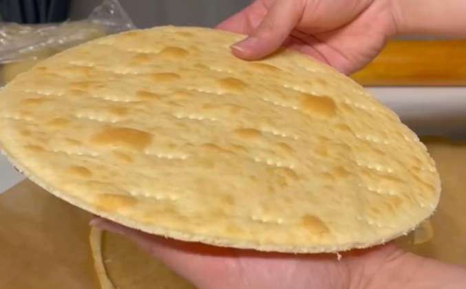 2. Взвесьте тесто и разделите на 9, чтобы узнать вес 1 колобка. Скатайте 9 шариков, накройте пленкой и в холодильник на 20 минут. Пергамент припылить мукой, раскатать круг из теста диаметром 26 см, наколоть вилкой, выпечь 5-7 минут при 200С до слегка золотистого цвета. Сразу горячий корж вырезать ножом, приложив тарелку 25 см.