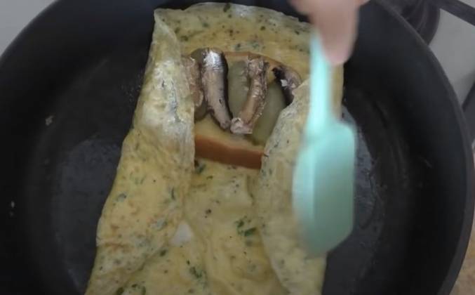 2. Делаем такой блинчик. Огонь убавляем, берем батон и слегка его вот так вот промакиваем, чтобы он у нас получился вкуснее и сочнее. Выкладываем и можем фаршировать всем, чем угодно. Я возьму маринованный огурчик, тоненько порезанный. Шпроты. Можно, конечно, взять сыр, колбасу , можно вообще взять мясо, которое осталось со вчерашнего ужина - тоже отлично получится. Аккуратно начинаем заворачивать блинчик. Края подвернем. Тут уголочек сделаем. И вот так вот заворачиваем. Вуаля!