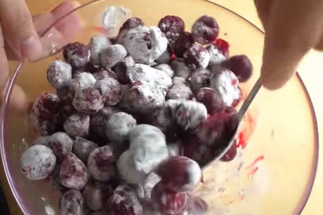 2. Тесто отлежалось. И сейчас мы его будем раскатывать в тонкий пласт. Можно прям воспользоваться этой же самой пленкой. Через нее удобнее, а можно через два слоя бумаги. Тесто, конечно, холодное работать с ним тяжеловато в начале. Но от этого оно будет только вкуснее. Будет такое рассыпчатое, песочное. Мне, например, раскатывать через два листа бумаги гораздо удобнее. Вот такой прямоугольник получился. Бумагу верхний слой можно убирать. Выкладываем на противень и формируем вот такие вот бортики. Для начинки я возьму пол килограмма вишни. Она у меня замороженная и 2 столовые ложки крахмала. Все хорошо перемешаем.