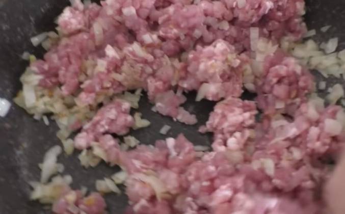 2. И обжариваем лук до золотистого цвета. К луку добавляем фарш и обжариваем его практически до готовности. Вот оставляем буквально, чтобы чуть-чуть не хватило нам до готовности. Пока мясо тушится, займемся кабачками. Если у вас совсем маленькие кабачки, можно прям их делить на ломтики. Я взяла и разделила пополам. Теперь вот такими тонкими ломтиками нарезаем. Добавим в кабачки пару столовых ложек растительного масла и хорошо перемешаем. Так, чтобы они покрылись маслом со всех сторон и теперь выкладываем на сухую сковородку и обжариваем до легкого-легкого золотистого цвета. Масла нам достаточно,которое на самих кабачках.