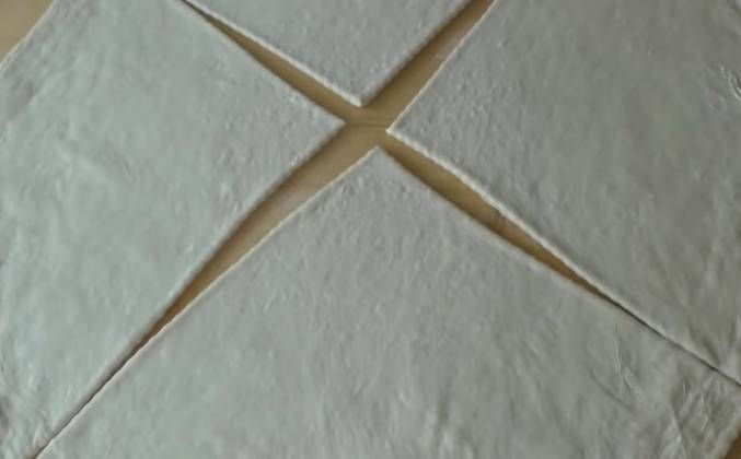 4. Превращаем колобки в лепешки, промазываем маслом. И складываем друг на друга. Полученную слоеную лепешку, сначала просто руками растягиваем. Чтобы она у нас не порвалась, хорошо растянулась. А потом можно подкатать и скалкой. Полученное тесто режем на сектора. И теперь аккуратненько сворачиваем вот в такие круасанчики-рогалики. Вот такие мини-круассаны у нас получились. Накрываем их пленкой, дадим расстояться минут 20. Круассаны расстоялись. Теперь я закипятила 2 литра воды и сюда добавляю две столовые ложки соды.
