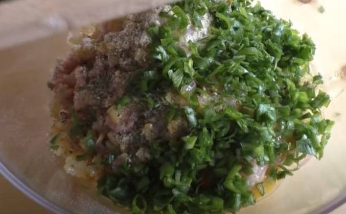 2. Буквально секунд 30 и добавляем одну луковицу, тоже порезанную кубиком. Золотистый лучок вместе с чесноком отправляем в фарш. У меня здесь 300 граммов. Еще я приготовил 4 столовые ложки сухарей. Тоже сюда. Щепотка соли, хорошая приправа для немецких колбасок, очень часто ее использую. Сюда же яйцо. Друзья, здесь у меня зелень - зеленый лук. И вот такой молоденький джусай - это такая замечательная травка с привкусом чеснока. Можно даже сказать - дикий лук. Отправляем сюда же мелко порубленную зелень. И хорошо вымешиваем.