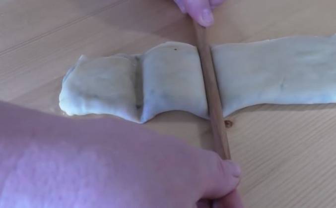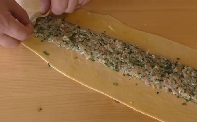 3. В оригинальном рецепте используется фарш из швабских колбасок, но, я думаю, у нас получится не менее вкусный. Такой же пряный, ароматный и очень сочный. Тесто отлежалось. Берем и раскатываем в длинную широкую полоску. Почти метровый пласт у меня получился. Тесто отличное, к столу не прилипает. Теперь берем ароматный фарш и распределяем его по центру нашей полоски. Чтобы все края хорошо скрепились, промажем их яйцом. Край подвернем и начинаем складывать - сначала одну сторону и теперь с этой стороны подтягиваем и заворачиваем.
