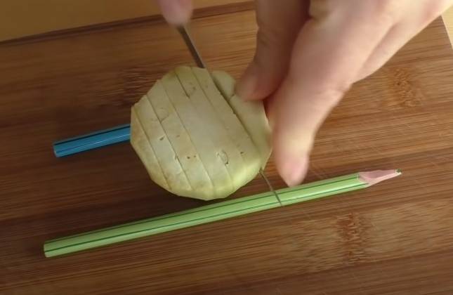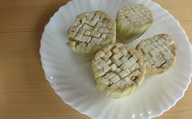 2. Баклажаны слегка присыпаем солью и оставляем буквально минут на десять. Баклажаны я уже промыла, сейчас подготовим крахмальную воду. В стакан воды добавляем. Полторы столовые ложки крахмала. Вода должна быть холодная и хорошо перемешиваем. Сейчас у нас, кстати, есть два варианта. Первый - это взять вот эти хризантемы и пожарить в большом количестве масла. Но мы поступим по-другому. Возьмем хризантемы. Окунем их в воду с крахмалом и будем отваривать на пару минут 12-15. Кстати, вот такая штука для отваривания на пару есть в любых хозтоварах и стоит она ,что-то порядка 150 рублей. Но, может быть, это было года два назад, сейчас может цены изменились, но не намного дороже. Баклажаны у нас будут в китайском стиле и очень даже не скучные.