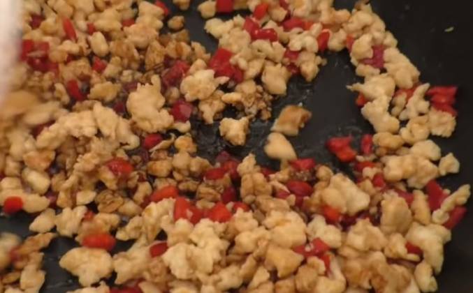 3. Обжариваем пару зубчиков чеснока, очень быстро, так чтобы он не успел стать коричневым. Иначе он будет горчить. Это займет буквально Секунд 10-15. Аромат от чеснока просто сумасшедший! Сюда же добавляем граммов 200 куриного фарша. Как только фарш обжарился, добавляем половину красного болгарского перца. У меня перец замороженный, он готовится молниеносно. Обычный перчик за пару минут точно приготовится. Добавляем в фарш одну-две столовых ложки соевого соуса. Ориентируйтесь на свой соус - он бывает погуще, более жидкий, бывает очень насыщенный. Поэтому тут такие весьма условные рекомендации.