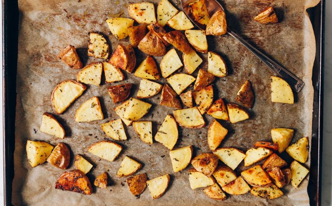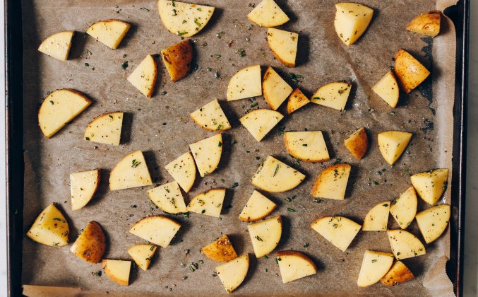 2. Добавить картофель на противень и сбрызнуть маслом авокадо. Картофель должен быть покрыт, но не пропитан маслом. Затем добавьте соль, перец и розмарин (по желанию) и хорошо перемешайте. Жарить до золотистого цвета и хрустящести, или около 20-25 минут. Вы будете знать, что он готов, когда получится золотисто-коричневый цвет снизу и по краям и нежная текстура в центре.