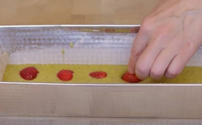 3. Готовое тесто перелить в форму. Распределить по тесту небольшие ягоды клубники. Чтобы ягоды выпекались красиво, класть их нужно целыми. Можно взять свежие, можно замороженные. Убрать тесто в духовку на 20-25 минут. Бисквит готов! Когда форма немного остыла, извлечь бисквит. Дать ему остыть. Сделать крем: Достать их холодильника заварную основу и хорошо промешать до пластичности. На малых оборотах вмешать в основу пару столовых ложек жирных сливок для взбивания для сравнивания консистенции.