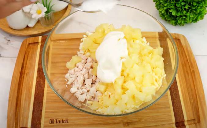 Салат Гавайский с курицей, ананасами, яйцами и сыром