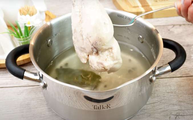 2. Я вынимаю из бульона, как остынет, и кладу в холодильник на пару часов до полного остывания. Вот такая сочная куриная грудка получается даже в остывшем виде. Теперь нарезаем куриную грудку кубиками. Отварим яйца. Итак, яйца холодные из холодильника кладем в ковш, заливаем холодной водой, подсаливаем и Ставим на плиту и доводим до кипения. Как закипит, варим 1-2 минуты и снимаем с огня. Крышку не открываем, даем постоять 10 минут.