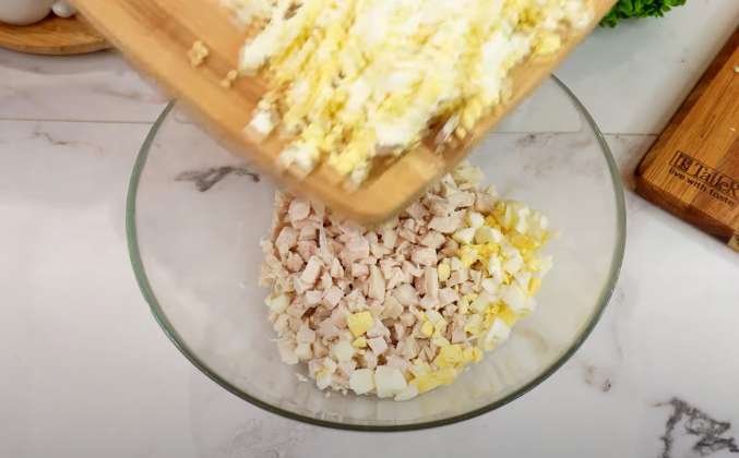 Как приготовить Салат Гавайский с курицей, ананасами, яйцами и сыром рецепт пошагово