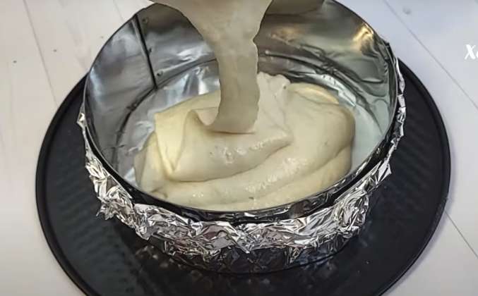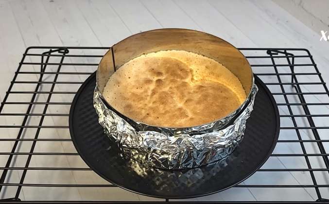 3. Перекладываем его в Заранее подготовленное кольцо диаметром 16 см. Кольцу Делаем донышко из фольги и устанавливаем на противень или, как в моем случае, дно от разъемной формы. Тесто немного разравниваем и убираем заранее разогретую до 180 градусов духовку на 10-15 минут. Я выпекала на режиме вверх-вниз без конвекции ровно 13 минут. Готовность бисквита можно проверить или деревянной шпажкой, или лёгким надавливанием пальцем на бисквит.