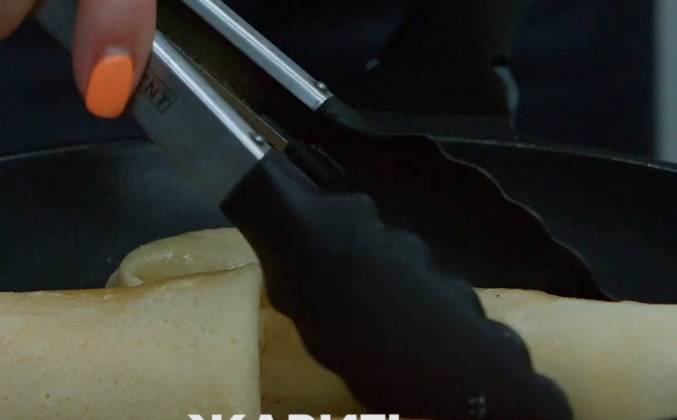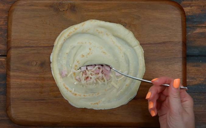 2. Сделай начинку из сыра (100 г) и ветчины (100 г). Перемешай нарезанную кубиками ветчину и тёртый сыр. Положи на блин 1 ст.л. начинки и заверни.Видео рецепт ютуб ниже 👇