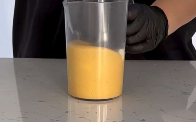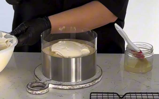 2. Крем: Если желатин листовой то замачиваем в высоком стакане или широкой форме в неограниченном количестве воды. Листовой желатин сам впитывает столько жидкости сколько ему необходимо. После того как он набух просто отжимаем слегка лишнюю жидкость и кладем в теплый крем. Если желатин гранулированный то замачиваем 1:6, т.е. 5 гр. желатина заливаем 30 гр. холодной воды. 100 гр. Лимонного крема нагреваем до 80С и объединяем с набухшим желатином. Выливаем к остальному крему, перемешиваем. Отдельно взбиваем охлажденные сливки до устойчивых пиков и объединяем с кремом.