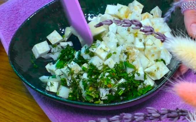 3. Также нам понадобится один корень сельдерея, сельдерей очищаем, теперь сельдерей нарезаем довольно крупным кубиком добавляем сельдерей к луку, также нам нужна зелень, у меня несколько стеблей укропа и петрушки, зелень мелко нарезаем, добавляем к овощам, добавляем соль по вкусу, я добавляю треть чайной ложки соли, чёрный перец по вкусу, одну столовую ложку лимонного сока и одну столовую ложку растительного рафинированного масла, перемешиваем, отправляем овощи в форму для выпекания, равномерно распределяем, на овощи выкладываем рыбу, для сочности и сливочного вкуса нам понадобится 20 г сливочного масла, масло нарезаем тоненькими пластинками и выкладываем на рыбу.