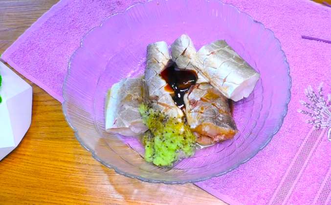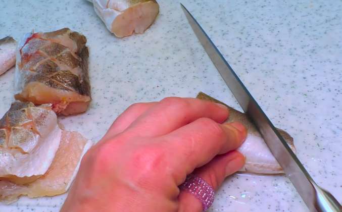 1. Для приготовления этого вкусного блюда из рыбы нам понадобится две тушки хека, хек очищаем от чешуи, удаляем плавники, сначала со стороны брюшка, затем со стороны спинки, теперь брюшко разрезаем, удаляем внутренности и обязательно удаляем чёрные плёнки, чтобы рыбка не горчила и промываем рыбку. Теперь хек нарезаем на порционные кусочки, у меня тушки небольшие, поэтому я их разрезала на три части, на каждом кусочке делаем надрезы на искосок с двух сторон, чтобы получились такие ромбики, не разрезая хребет.
