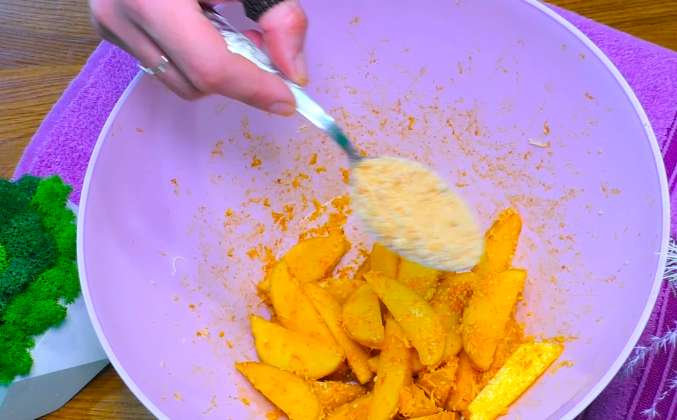 4. Накрываем форму фольгой и отправляем рыбу в духовку разогретую до 180° на 30-40 минут, смотрите по своей духовке, тем временем подготовим гарнир, нам понадобится четыре картошки, картофель разрезаем пополам и каждую половинку нарезаем на четыре скибочки, промакиваем картофель бумажными полотенцами, чтобы убрать лишнюю влагу и отправляем в миску, добавляем соль по вкусу, я добавляю пол чайной ложки соли, чёрный перец по вкусу, половину чайной ложки гранулированного чеснока, 1/3 чайной ложки куркумы, 1/2 чайной ложки сладкой копчёной паприки, добавляем одну столовую ложку кунжута и две столовые ложки растительного рафинированного масла.