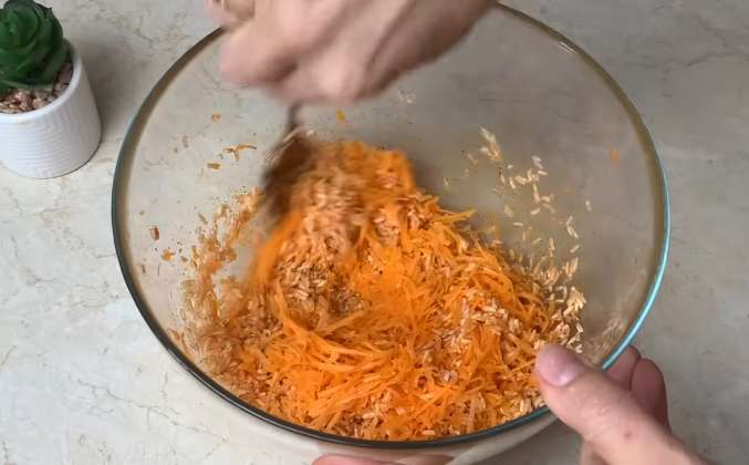 2. К рису я добавлю одну чайную ложку сладкой молотой паприки. Немного больше, чем треть чайной ложки соли и 2 столовых ложки растительного масла. Рис с приправами сразу хорошо перемешаю. Вот так. Затем я беру одну морковь и натираю на средней терке. Морковь добавляю к рису и опять перемешиваю рис с морковью. Форму для запекания смажу растительным маслом. Рис с морковью и приправами перекладываю в эту форму и распределяю. Половину луковицы разрезаю пополам и также кладу к рису. А теперь заливаем рис горячей водой.