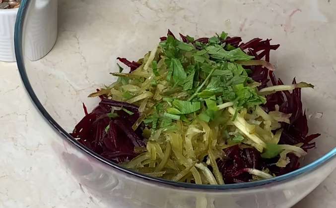 3. Пару веточек петрушки нарезаем мелко. Ну и, конечно, добавим в салат остывший лук и 2 столовых ложки майонеза. Если вы не используете майонез, его можно заменить парой столовых ложек душистого нерафинированного масла. Осталось только этот салат слегка посолить по вкусу и перемешать. Как видите, все готовится очень просто, из простых доступных ингредиентов и быстро. Но салат при этом получается очень вкусный и интересный.Видео рецепт ютуб ниже 👇