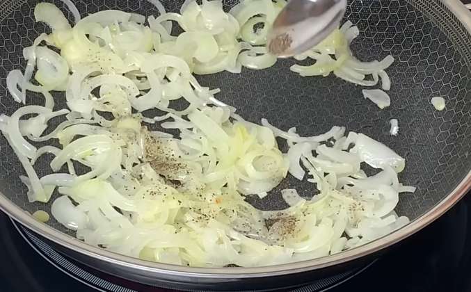 2. И сразу все хорошо перемешиваю. Сахар нам нужен, чтобы на луке образовалась приятная вкусная карамель. Так и салат в целом будет вкуснее. После добавления этих приправ лук перемешиваем две минуты. Убираем сковороду с огня. Даем луку остыть. Пока лук остывает, измельчим соленые (квашеные или маринованные) огурцы (на ваш выбор). Но, по-моему, больше всего подходят именно соленые огурцы. Их понадобится 2-3 штучки в зависимости от размера. Огурцы натираем также, как и свеклу.