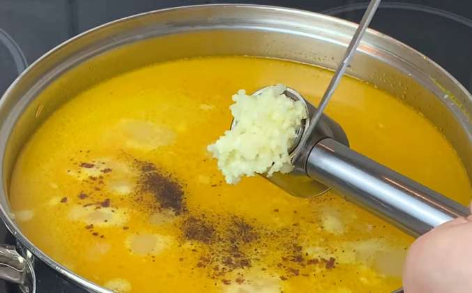 3. Дальше я кладу один небольшой лавровый лист, хорошую щепотку чёрного молотого перца. И также добавляю приправу, которая просто идеально подходит в сырный суп. Это молотый мускатный орех. Такая хорошая щепотка. Также пропускаю через пресс два зубчика чеснока. Даю супу покипеть одну минуту. А теперь добавляю в суп заранее измельчённую зелень. И также добавляю в суп 15 г сливочного масла. Со сливочным маслом этот суп будет особенно вкусным, нежным, со сливочным вкусом. Перемешиваю и убираю с огня. Оставим суп на 5 минут настояться. Вот и всё, приятного аппетита! Быстро и очень просто!Видео рецепт ютуб ниже 👇