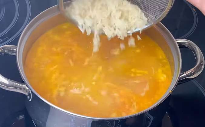 2. Продолжаем его варить на небольшом огне. После закладки овощей я сразу же беру 100 г риса. Конечно же, хорошо его промываю и высыпаю в суп. Пока суп варится, подготовим остальные ингредиенты. В самом конце я буду добавлять зелень. Поэтому я нарежу немного укропа и немного зелёного лука. Они прекрасно подходят в этот суп. И также я натру 100 г сыра с нежным вкусом. Вместо твёрдого сыра можно использовать качественный плавленый сыр. Когда рис уже практически готов, пора добавлять все оставшиеся ингредиенты. Я высыпаю сыр. Размешиваю суп. Сыр сразу же начинает плавиться, видите?