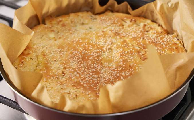 3. Форму для выпекания выстелить пергаментом и перелить ½ части теста, переложить начинку и покрыть второй частью теста. Посыпать сверху кунжутом. Отправить форму с пирогом в заранее разогретую до 180 градусов духовку на 40 минут. Дать готовому пирогу остыть в течение 15 минут. Нарезать на порционные куски.Просто Кухня рецепты с 2020-2022