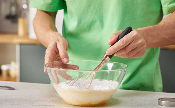 2. Тесто: В большую миску разбить 2 яйца и добавить щепотку соли, взбить венчиком. Добавить 2 щепотки сахара и продолжить взбивать. Влить в тесто кефир, а затем добавить рисовую муку и разрыхлитель. Перемешать венчиком до однородности. Совет от шефа: Тесто быстро густеет, поэтому его нужно сразу же переливать в форму и выпекать.