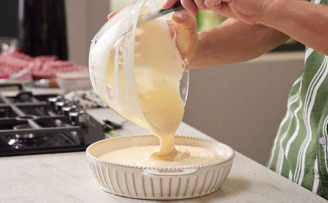 3. Отправить взбитые белки порциями в общую массу и постепенно аккуратно, нежно перемешивая силиконовой лопаткой. В круглую форму с высокими бортами перелить полученную массу. В небольшой поддон поставить форму с пудингом и налить рядом воду до половины стенок формы с пудингом. Отправить в заранее разогретую до 175 градусов духовку на 45-50 минут без конвекции. Совет от шефа: При выпекании пудинга нужен равномерный нагрев, который создаст поддон с водой, в котором стоит форма с пудингом.Просто Кухня рецепты с 2020-2022