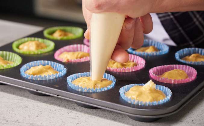 3. В тефлоновую форму с углублениями для кексов отправить бумажные формочки и в каждую переложить тесто наполнив их на 2/3 части. Углубить конец кондитерского пакета в тесто и выдавить начинку, быстро вытащить из теста. Таким образом начинить каждую формочку с тестом.