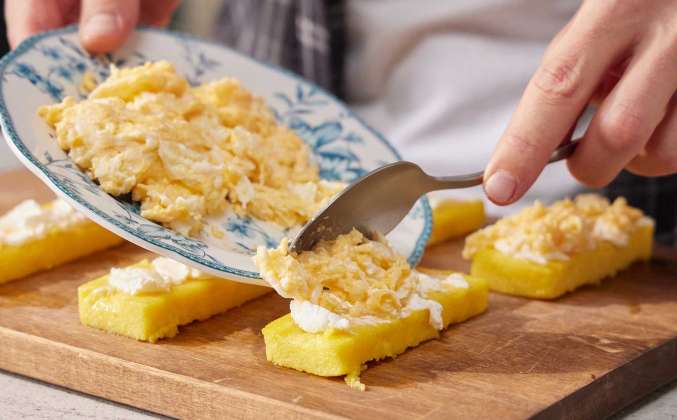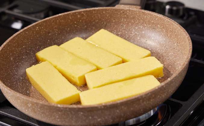 2. Отправить в холодильник до полного остывания. Плотную застывшую поленту вытащить из бокса, отрезать неровные края по бокам и нарезать на тосты около 1,5 см толщиной. Скороду разогреть и налить 20 мл подсолнечного масла, отправить поленту на сковороду и обжарить по ½ минуты с двух сторон. Обжаренную поленту переложить на доску. Каждый тост намазать сливочным сыром (по 10 г).