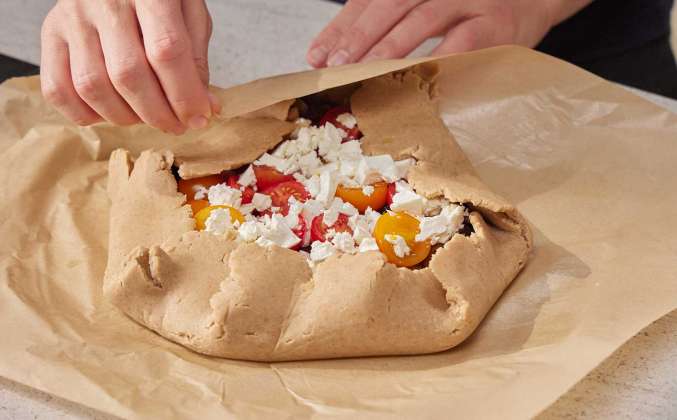 3. С помощью пергамента сложить краешки к центру к начинке, слегка накрыв её. Переложить галету на пергаменте на противень и отправить в заранее разогретую до 180 градусов духовку на 30 минут. Дать готовой галете немного успокоиться и остыть. Готовую галету украсить листиками базилика и взбрызнуть оливковым маслом.Просто Кухня рецепты с 2020-2022