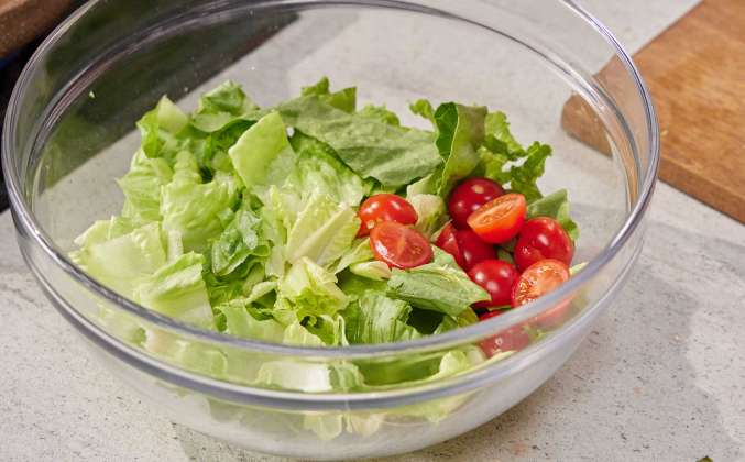 2. Салат нарезать на крупные куски, черри пополам и отправить в большую миску. Заправка: Смешать йогурт, горчицу, мёд, измельчённый чеснок, уксус и рыбный соус. Перелить заправку к салату и помидорам и забросить гренки, перемешать.