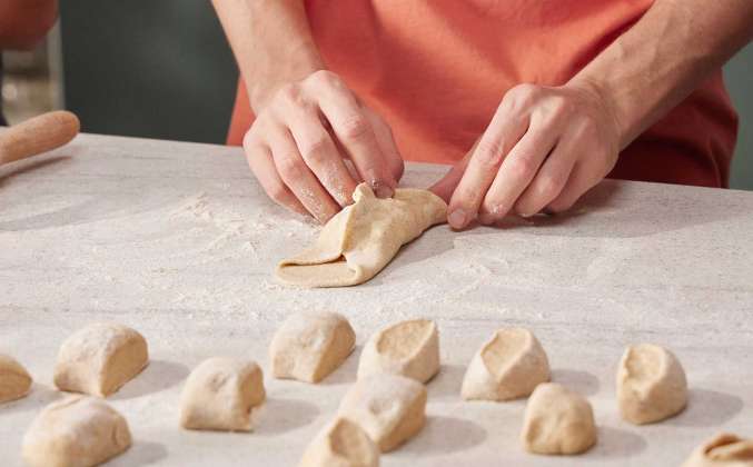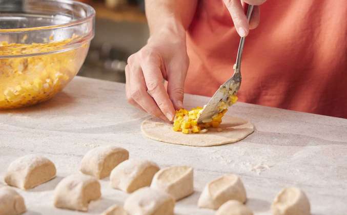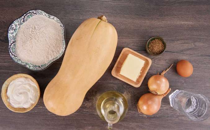 2. Томлённый лук снять с нагрева и добавить ещё кусок сливочного масла (30 г). У тыквы отрезать кожицу, нарезать слайсы тыквы мелким кубиком и посолить большой щепоткой. Отправить лук со сливочным маслом к тыкве. Зиру перетереть в ладонях и закинуть в начинку, перемешать. Насыпать муку (50 г) на подпыл и отправить тесто на стол, скатать колбаску средней толщины и нарезать на 16 ровных кусков. Раскатать каждый кусок в небольшой кружок, положить по 1 ст. л. начинки.