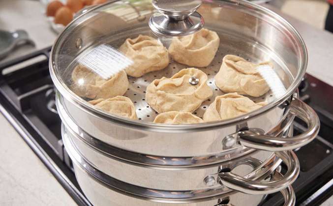 4. Переложить манты с небольшим расстоянием друг от друга в ёмкости-ярусы мантоварки, поставить ярусы с мантами на дно мантоварки с кипящей солёной водой, накрыть крышкой и готовить 40 минут. Растопить в сотейнике сливочное масло 50 г и смазать готовые манты кондитерской кисточкой. Переложить манты на большие сервировочные тарелки и подавать со сметаной.Просто Кухня рецепты с 2020-2022