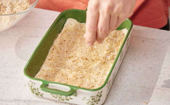 2. В сотейник на медленном нагреве растопить 100 г сливочного масла. Дно формы для запекания смазать растопленным маслом и переложить раскатанный кусок теста и ещё раз смазать маслом. Посыпать орешками с сахаром, покрыть ещё слоем теста, смазать маслом и опять посыпать тонким слоем орешек с сахаром. Таким образом собрать и промазывать маслом каждый слой, оставив последний слой только смазанным маслом. Затем разрезать собранные слои пополам по длине, и ещё пополам каждую половину по длине, а затем нарезать перпендикулярно полученным полоскам диагональными полосками, чтобы получился ромбовидный узор.