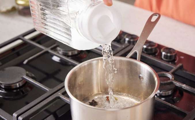 4. Сироп: В сотейник на среднем нагреве отправить звёздочки бадьяна, зёрна кардамона, зонтики гвоздики и нагреть специи в течение 1/2 минуты до запаха пряностей. Влить 100 мл воды и довести до кипения. Затем всыпать сахар (100 г), перемешать и растворить.