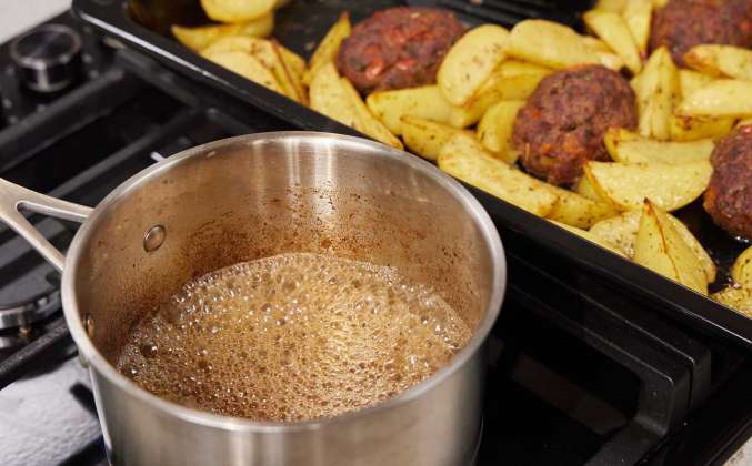 4. Выпарить сок в сотейнике в течение нескольких минут. Сервировка: На порционную тарелку переложить картофель с котлетой, полить котлету выпаренным соком и украсить листиками любой любимой зелени.Просто Кухня рецепты с 2020-2022