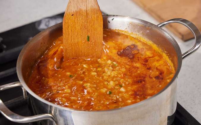 2. В кастрюлю с фаршем и овощами отправить два вида чечевицы и обжарить несколько минут. Влить горячую воду (2-2,5 л), перемешать и довести до кипения и варить на медленном огне 15-20 минут до готовности чечевицы и фарша. Веточки петрушки мелко нарезать и отправить в суп. Добавить в кипящий суп 1 ч. л. с горкой копчёной паприки и перемешать.