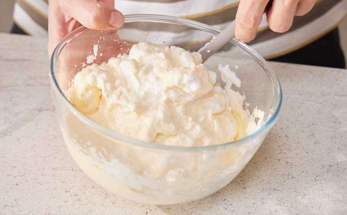 3. В миску с 4 желтками всыпать 110 г сахара и взбить миксером венчиками до увеличения в объёме и растворения сахара. В середине взбивания влить подсолнечное масло (30 мл) и продолжить взбивать. Часть взбитых белком отправить во взбитые желтки и аккуратно перемешать силиконовой лопаткой. Затем переложить вторую часть взбитых белков и аккуратно всё перемешать. В отдельной миске смешать 40 г муки, разрыхлитель и мак. Перемешать до однородности и аккуратно всыпать в тесто движениями поднимая тесто снизу вверх, а потом сверху вниз для равномерного перемешивания, не повреждая воздушную текстуру.