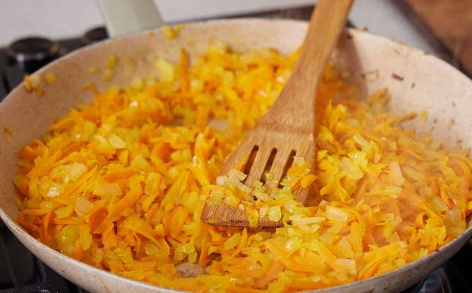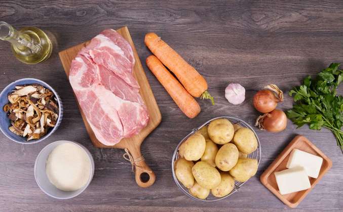 3. Через 1,5 часа после запекания мяса, противень с картофелем отправить в духовку к мясу на 30 минут, увеличив температуру до 200 градусов. Грибы отжать и мелко хаотично нарезать. Переложить в сотейник и влить воду, отжатую от грибов.