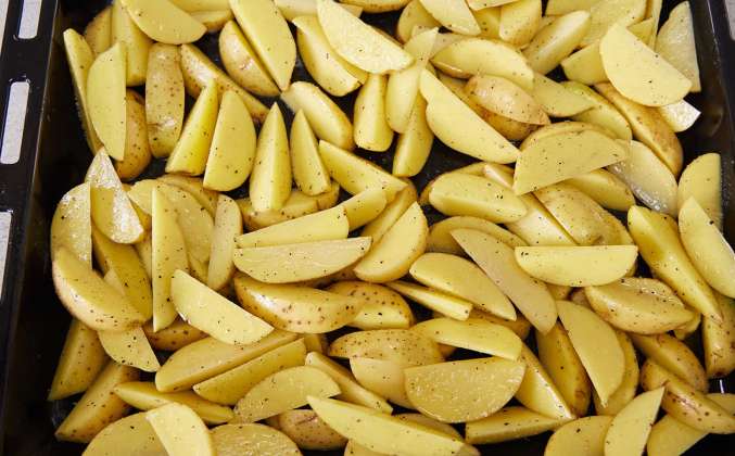 2. Завернуть мясо в рулет, плотно поджимая края. Зафиксировать рулет с помощью кулинарной бечёвки, двигаясь от открытого края по всей поверхности к другому краю затягивая большими петлями. Отправить мясо в форму, плотно зафиксировать, покрыть слоем пергамента и тремя слоями фольги, плотно прижав её к краям формы. Отправить мясо в заранее разогретую до 180 градусов духовку минимум на 2 часа. Картофель нарезать крупными дольками, поперчить, посолить и полить 40 мл подсолнечного масла, хорошенько перемешать и переложить на противень.