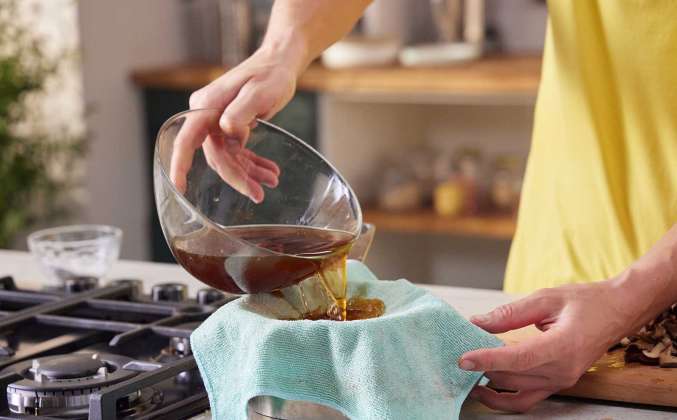 4. Вытащить из духовки мясо, которое запекалось 2 часа, убрать пергамент и фольгу и перелить сок из формы от запечённого мяса в сотейник к грибам. Мясо вернуть обратно в духовку и запекаться ещё 20 минут.