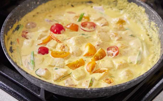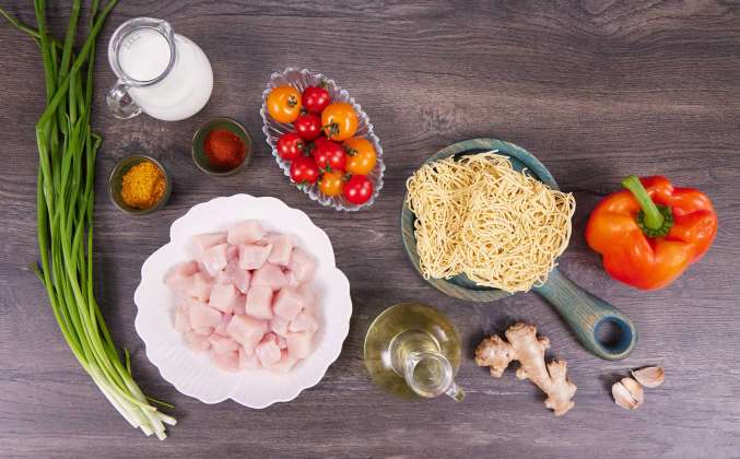 2. Отправить лапшу в кипящую воду и варить до готовности 2-4 минуты. Болгарский перец нарезать тонкой соломкой, зелёный лук брусочкам и добавить к курице, продолжить обжаривать на сильном нагреве в течение 1 минуты. Влить к курице сливки, добавить паприку и куркуму, перемешать и довести до кипения.